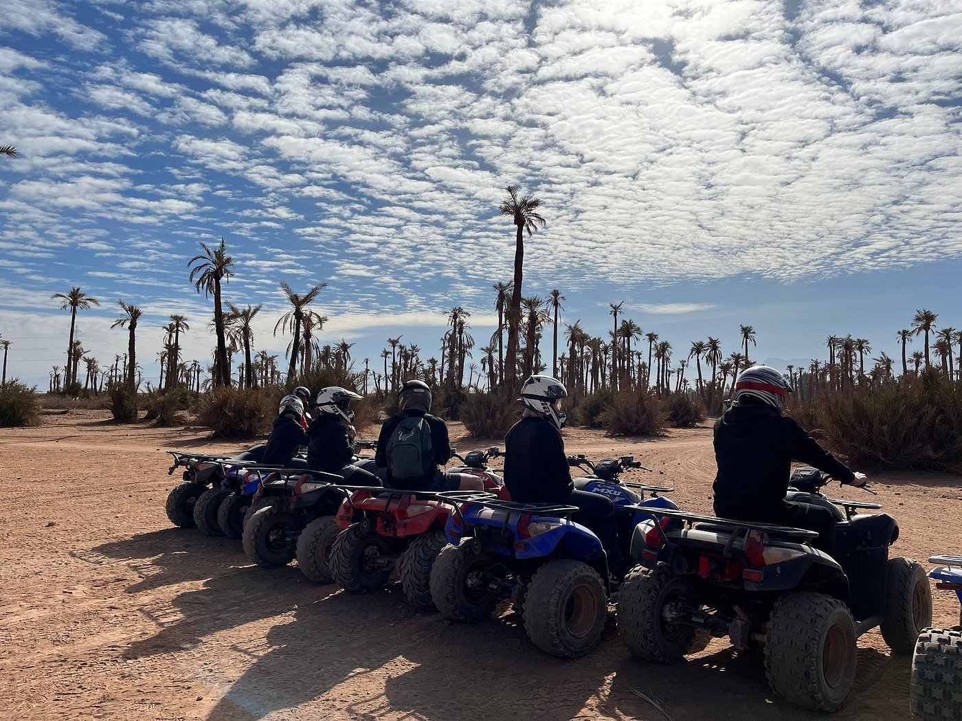 Un guide expert vous accompagnera pour vous assurer une expérience à la fois excitante et sécurisée, tout en vous permettant de découvrir des paysages insoupçonnés. En chemin, vous aurez l'occasion de découvrir des villages berbères traditionnels et d’observer de près la vie quotidienne des habitants, tout en profitant de panoramas spectaculaires. Faites une pause pour capturer quelques photos souvenirs avec le décor naturel pittoresque en toile de fond. Cette expérience, à la fois ludique et immersive, vous permettra de vous évader de l'agitation de Marrakech tout en profitant d’un moment d’aventure. Après votre parcours, retour au point de départ pour un rafraîchissement bien mérité et un débriefing avec notre équipe. Une excursion parfaite pour faire le plein d’énergie et explorer autrement les paysages uniques de la Palmeraie !